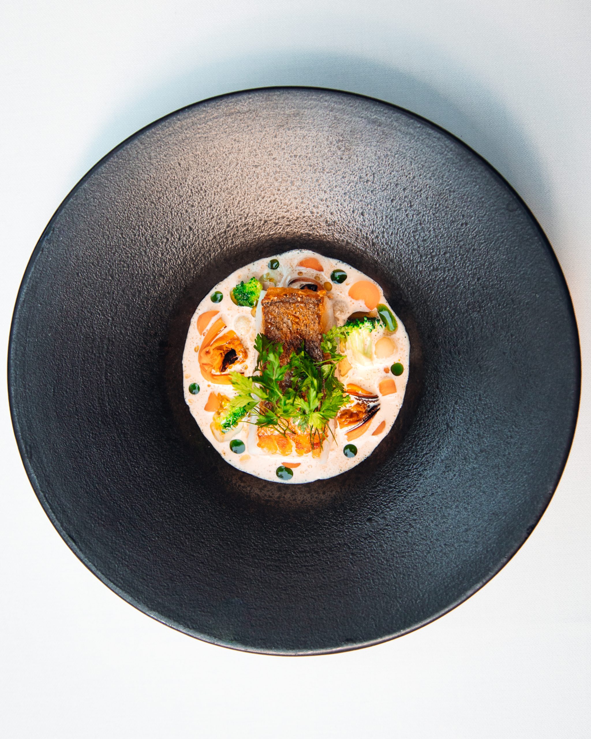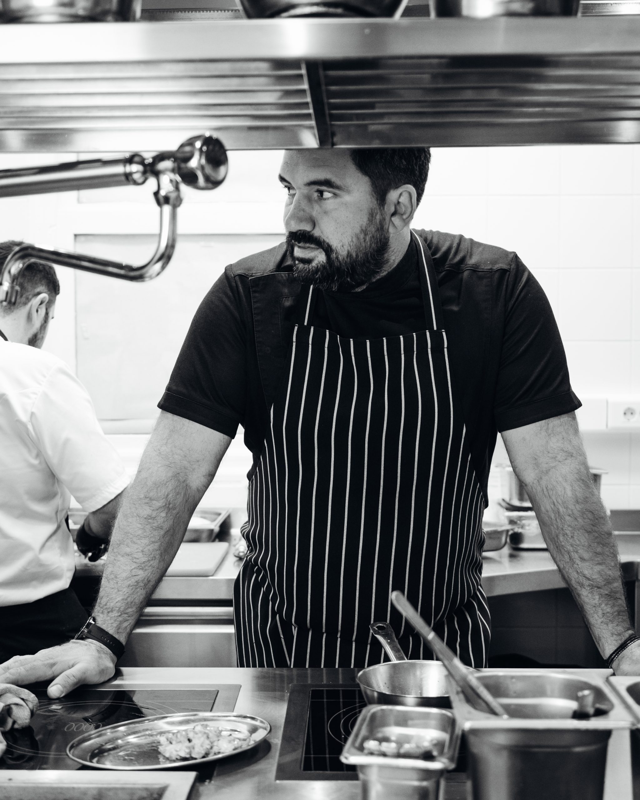 Με αυτά τα «υλικά», δημιουργεί πιάτα με βαθιά νοστιμιά που δομούν τη Νέα Ελληνική Κουζίνα, ιντριγκάροντας τη σκέψη και τον ουρανίσκο.